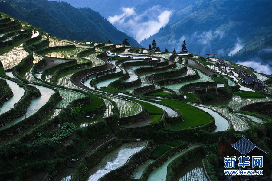 這是從江縣加榜鄉(xiāng)加車梯田風(fēng)光(5月27日攝)。夏日時節(jié),位于貴州省黔東南苗族侗族自治州從江縣加榜鄉(xiāng)加車、加頁、黨扭等苗寨的梯田在晨霧與陽光的映襯下線條分明,光影變幻,景色如畫。新華社記者 楊文斌 攝