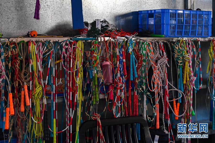 跳繩運(yùn)動(dòng)已經(jīng)深深融入七星小學(xué)的日常,器材室里擺放的跳繩(2019年11月18日攝)。新華社記者劉大偉攝