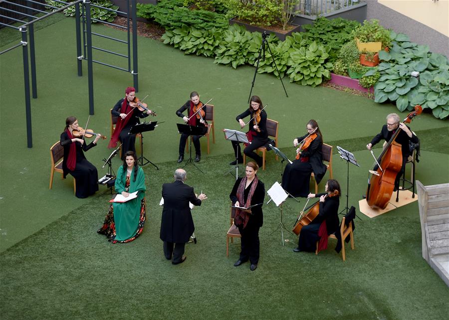 5月30日,在奧地利維也納“時(shí)代精神”酒店的庭院內(nèi),歌劇樂團(tuán)為觀眾演出。當(dāng)日,奧地利首都維也納的一家名為“時(shí)代精神”的酒店為迎接“解封”后恢復(fù)營業(yè),在其庭院內(nèi)舉辦“窗口音樂會”。按照奧政府此前公布的“解封”時(shí)間表,從29日起,賓館酒店以及健身房、游泳池和游樂場等休閑娛樂場所有條件恢復(fù)運(yùn)營。新華社記者郭晨攝