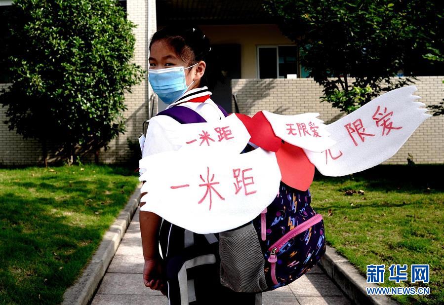 6月2日,上海閔行區(qū)鑫都小學(xué),一名小學(xué)生戴著“一米翅膀”走在校園里。當(dāng)日,上海小學(xué)一、二、三年級學(xué)生返校開學(xué)。新華社記者張建松攝