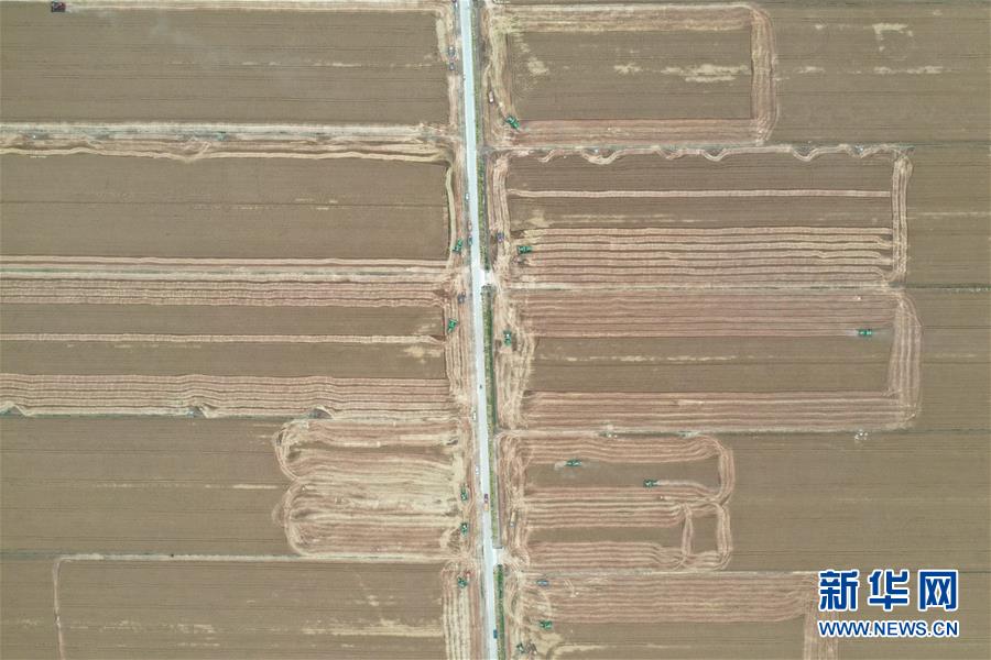 6月2日,在河南省黃泛區(qū)農場九分場的麥田里,農民操作大型收割機收獲小麥(無人機照片)。新華社記者馮大鵬攝。