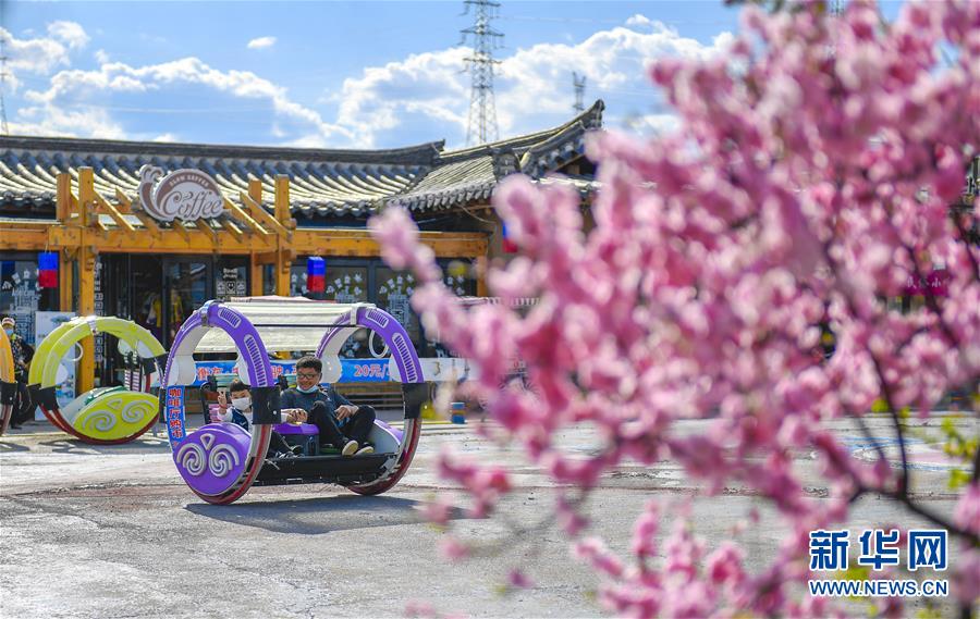 在延邊朝鮮族自治州和龍市“金達(dá)萊”民俗村,村民在村內(nèi)的咖啡館前體驗親子游樂項目(5月6日攝)。新華社記者許暢攝。