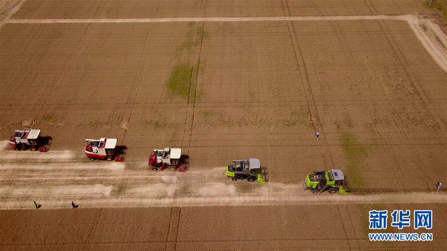 6月3日,收割機(jī)在汶上縣郭倉鎮(zhèn)的麥田里收獲小麥(無人機(jī)航拍)。目前,我國第二大小麥主產(chǎn)區(qū)山東6000多萬畝小麥進(jìn)入收獲階段。農(nóng)民們搶抓有利天氣,自南向北陸續(xù)開鐮。新華社記者郭緒雷攝。