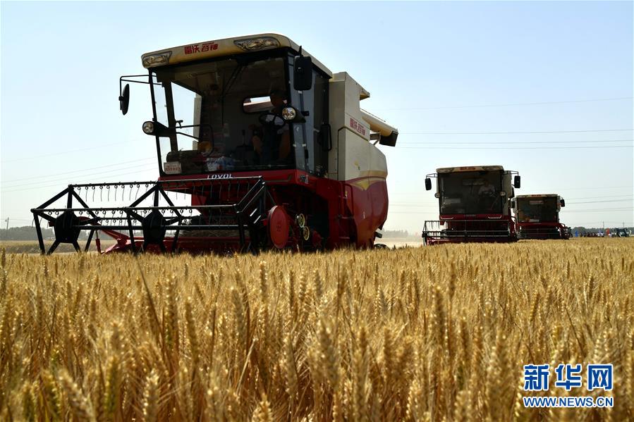 6月3日,在汶上縣郭倉鎮(zhèn),收割機(jī)在收獲小麥。目前,我國第二大小麥主產(chǎn)區(qū)山東6000多萬畝小麥進(jìn)入收獲階段。農(nóng)民們搶抓有利天氣,自南向北陸續(xù)開鐮。新華社記者郭緒雷攝。
