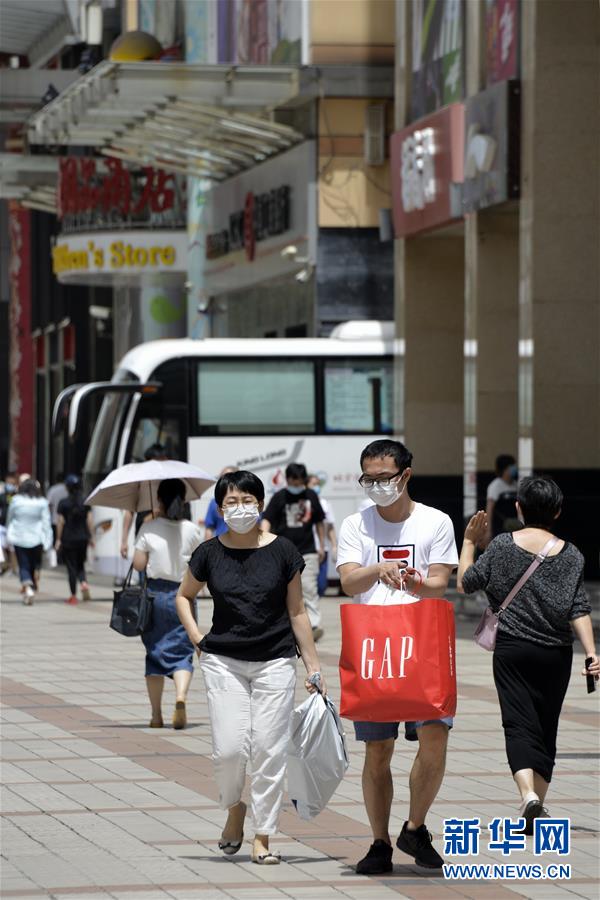 6月3日,市民及游客在王府井步行街購(gòu)物。近日,游人和市民紛紛來(lái)到北京市的王府井、西單、前門(mén)大街等著名商業(yè)街購(gòu)物休閑,這些老商業(yè)街開(kāi)始逐步恢復(fù)昔日的繁華。新華社記者李欣攝。
