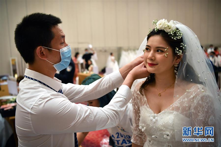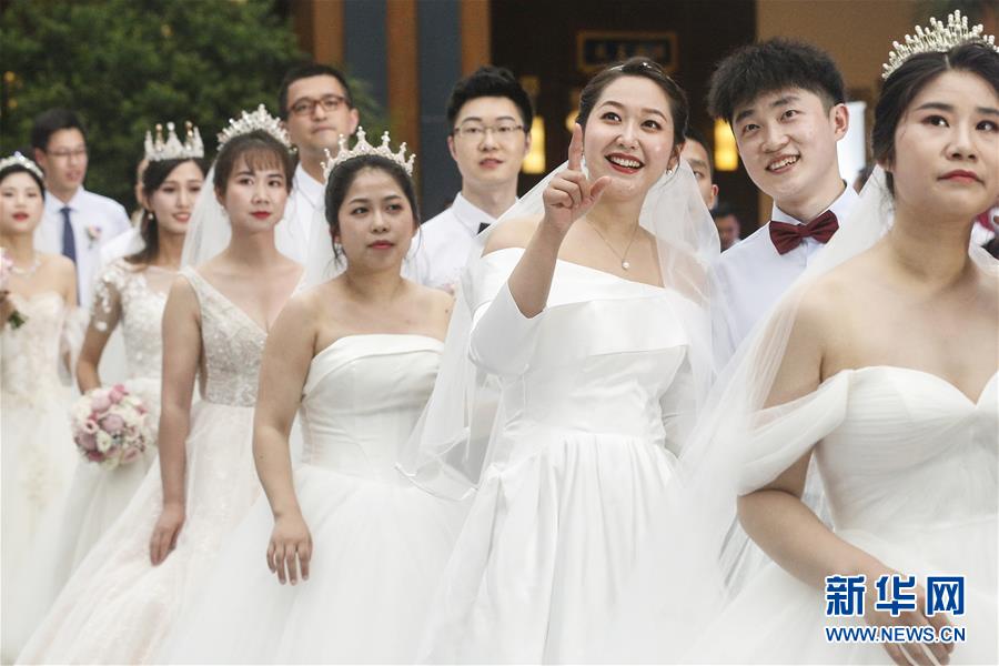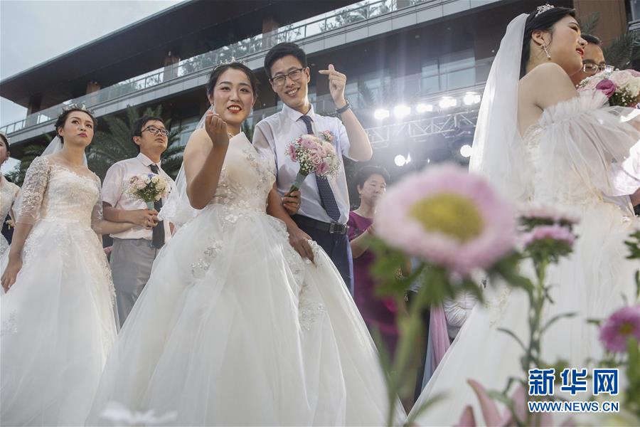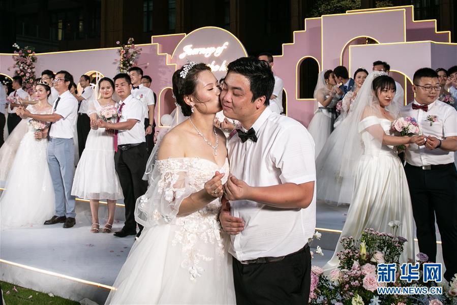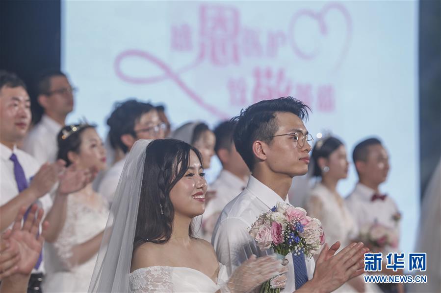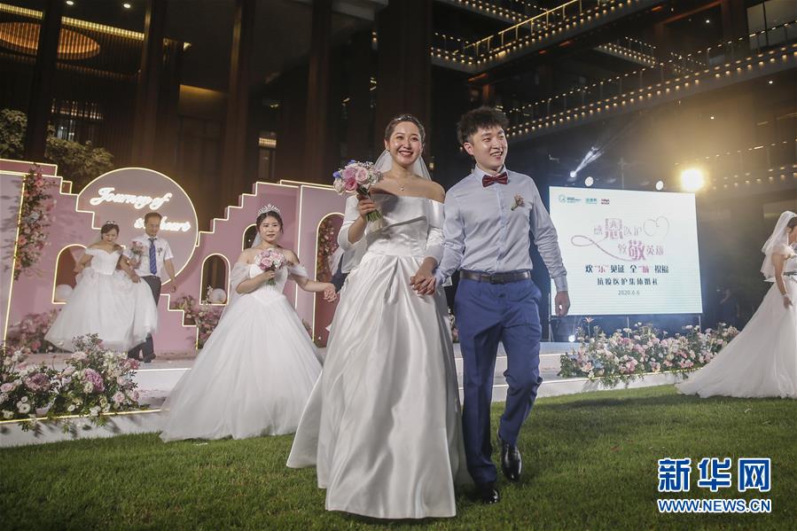 6月6日,新人在海南博鰲樂城國際醫(yī)療旅游先行區(qū)參加集體婚禮。當日,來自北京、武漢、廣州等地的30對新人在海南博鰲樂城國際醫(yī)療旅游先行區(qū)參加了一場集體婚禮。參加婚禮的部分新人此前因參加湖北的抗疫工作而推遲了婚期。  新華社記者 張麗蕓 攝
