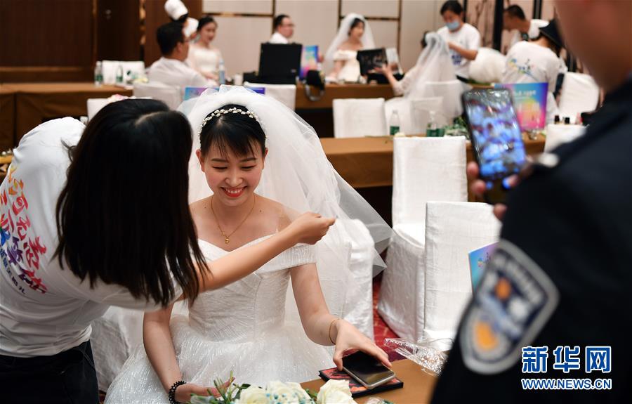 6月6日,海南省萬寧市公安局疫情防控指揮部民警騰凱彪在為正在化妝的妻子侯俊霞拍照。 當日,來自全國15個省份的百對新人在三亞市亞特蘭蒂斯度假區(qū)舉行了一場特殊的集體婚禮,每對新人中至少有一位參與過抗擊新冠肺炎疫情的工作。 新華社記者 郭程 攝
