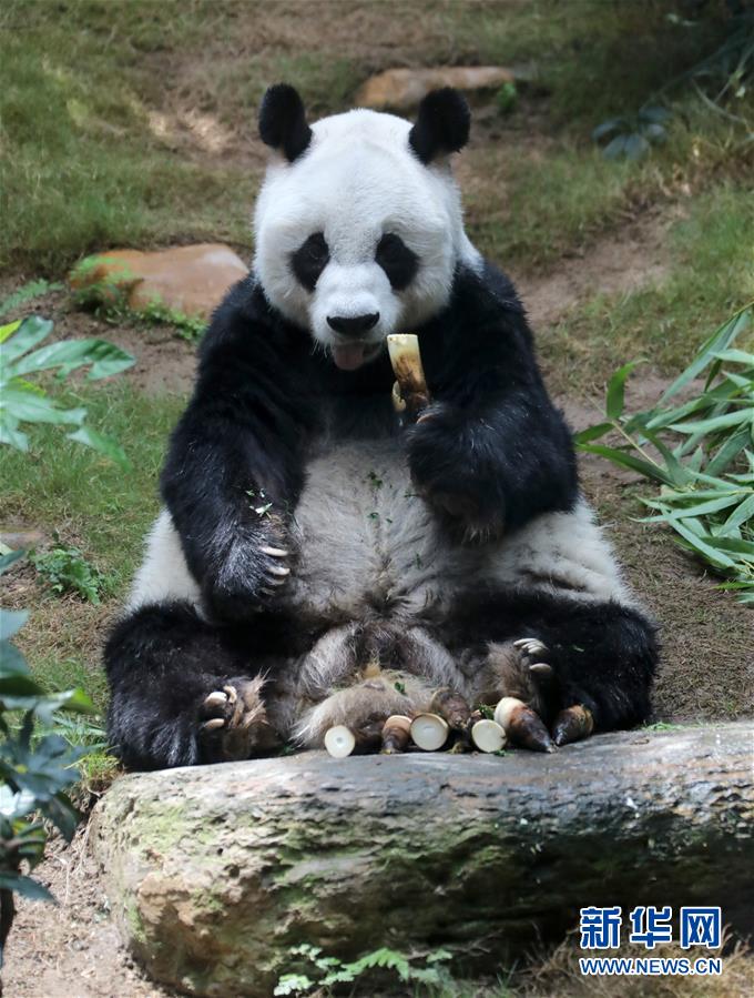 在香港海洋公園,大熊貓“安安”坐在小山坡上進食(5月11日攝)。新華社記者吳曉初攝