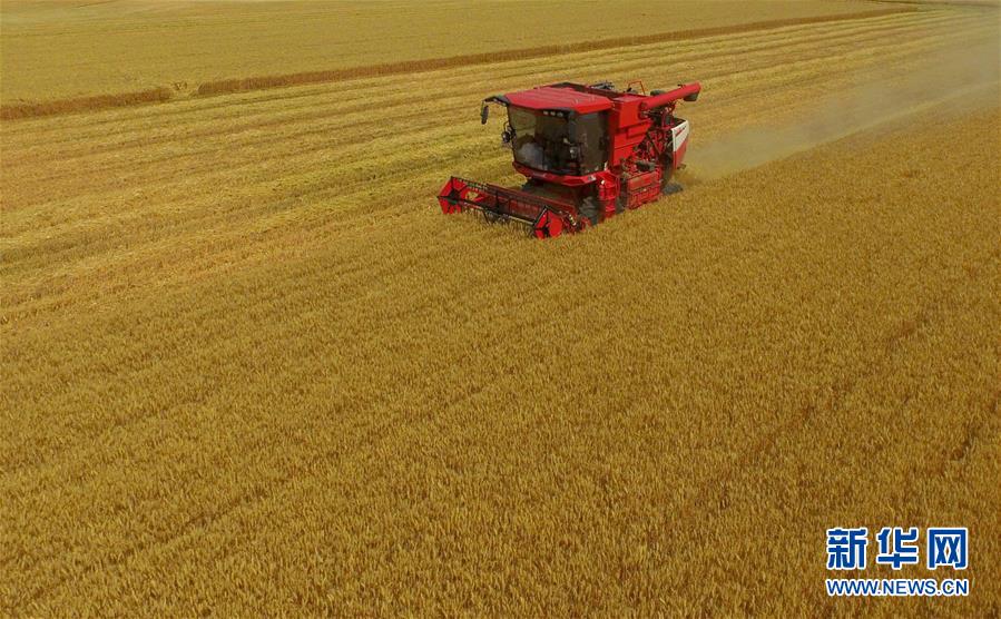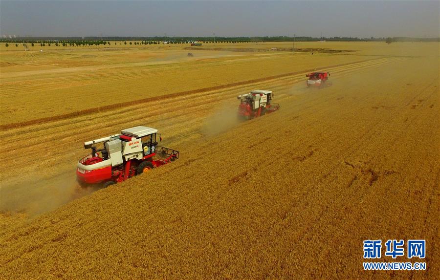6月8日,聯(lián)合收割機在河北省南和縣閆里鄉(xiāng)閆里村麥田進行夏收作業(yè)(無人機照片)。“三夏”期間,河北省預(yù)計組織和調(diào)度小麥聯(lián)合收割機、拖拉機、夏玉米播種機等200萬臺農(nóng)業(yè)機械投入作業(yè)。新華社記者朱旭東攝