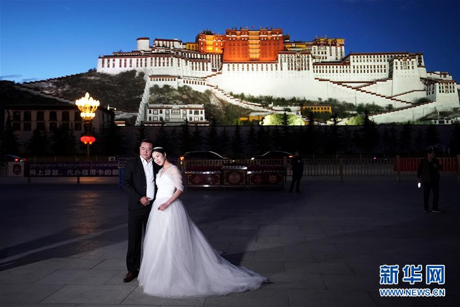 人們?cè)诓歼_(dá)拉宮廣場(chǎng)拍照(6月8日攝)。夜幕降臨,西藏拉薩布達(dá)拉宮燈光璀璨,夜景迷人。新華社記者詹彥攝