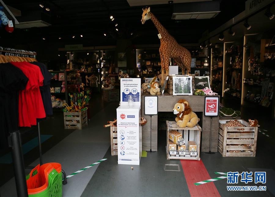 6月9日,法國巴黎動物園的紀念品商店入口處為游客提供消毒免洗洗手液,并在地上標注了參觀方向。受新冠疫情影響關閉了近3個月的巴黎動物園于8日重新開放。新華社記者高靜攝