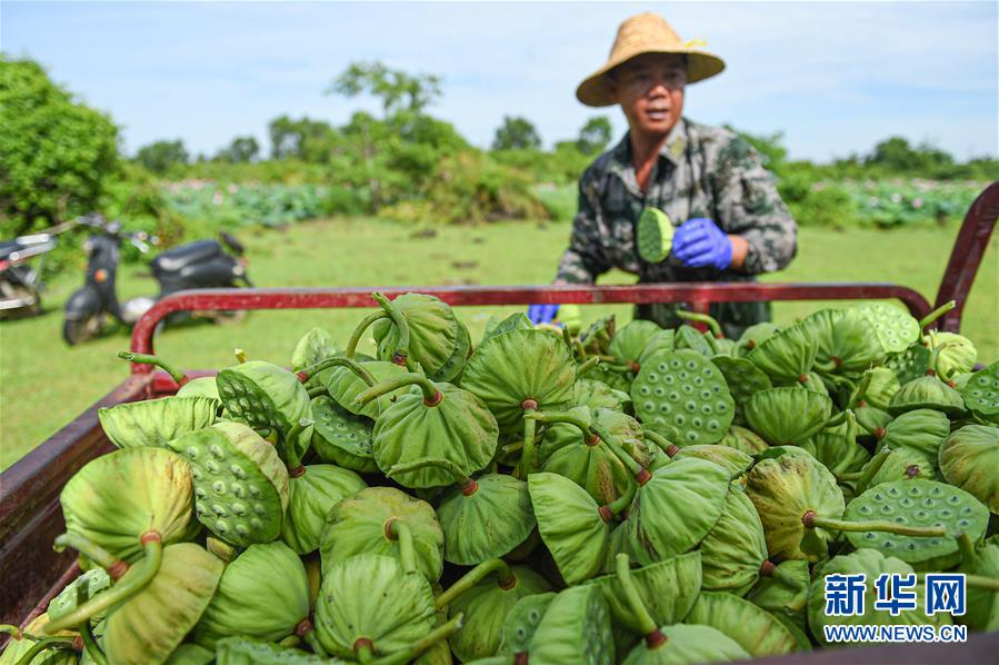 6月9日,村民在??邶埲A區(qū)龍泉鎮(zhèn)椰子頭村裝運采摘的蓮蓬。初夏時節(jié),位于海南海口龍華區(qū)龍泉鎮(zhèn)的蓮蓬逐漸成熟,當(dāng)?shù)卮迕窦泳o采摘,一派繁忙景象。新華社記者蒲曉旭攝