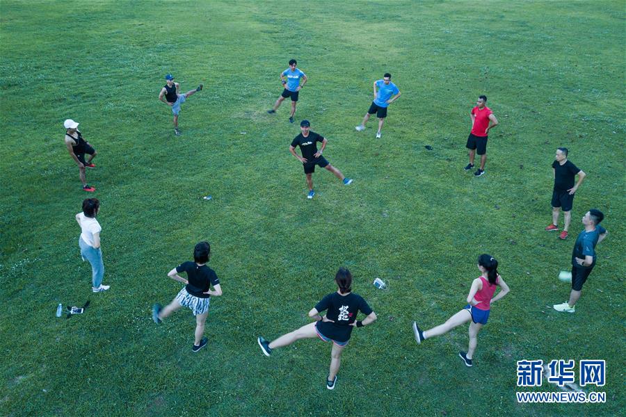6月11日傍晚,在??谌f綠園,市民在夜跑前做熱身運動(無人機(jī)拍攝)。近年來,夜跑成為越來越多都市人熱衷的健身方式之一。在海南海口,每當(dāng)夜幕降臨,“夜跑族”來到??谌f綠園、世紀(jì)公園等夜跑場所跑步,用一身酣暢淋漓的汗水?dāng)[脫白天工作中的壓力,享受跑步帶來的歡愉。新華社記者 蒲曉旭 攝