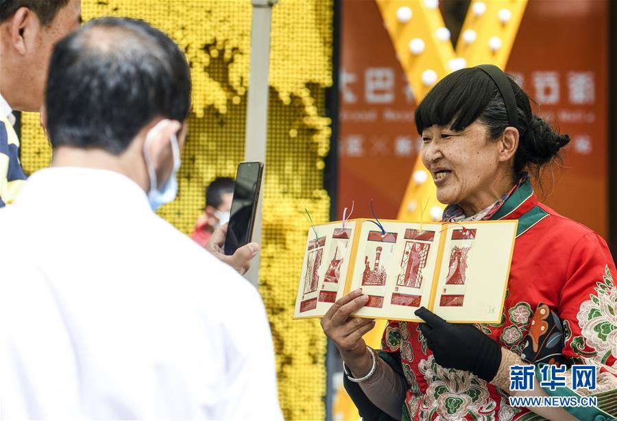 6月12日,在位于烏魯木齊大巴扎景區(qū)內(nèi)的活動(dòng)現(xiàn)場,手藝人、新疆剪紙技藝傳承人王革(右)向參觀者展示國家級(jí)非物質(zhì)文化遺產(chǎn)——中國剪紙。6月12日,“文旅融合,文物賦彩,非遺傳承,健康生活”2020年烏魯木齊市天山區(qū)文化和自然遺產(chǎn)日推介展演活動(dòng)在大巴扎景區(qū)舉辦,吸引不少游客和市民觀賞。新華社記者王菲攝。
