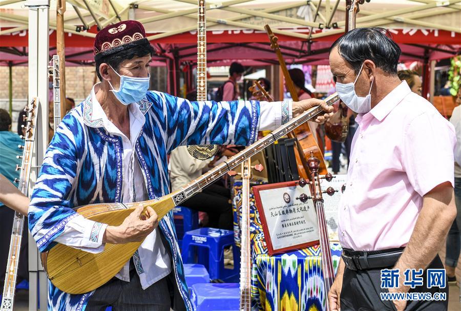 6月12日,在位于烏魯木齊大巴扎景區(qū)內的活動現(xiàn)場,新疆維吾爾自治區(qū)非物質文化遺產傳承人艾爾肯·吐么爾(左)在“維吾爾族樂器制作技藝”非遺項目展區(qū)演奏都塔爾。6月12日,“文旅融合,文物賦彩,非遺傳承,健康生活”2020年烏魯木齊市天山區(qū)文化和自然遺產日推介展演活動在大巴扎景區(qū)舉辦,吸引不少游客和市民觀賞。新華社記者王菲攝。