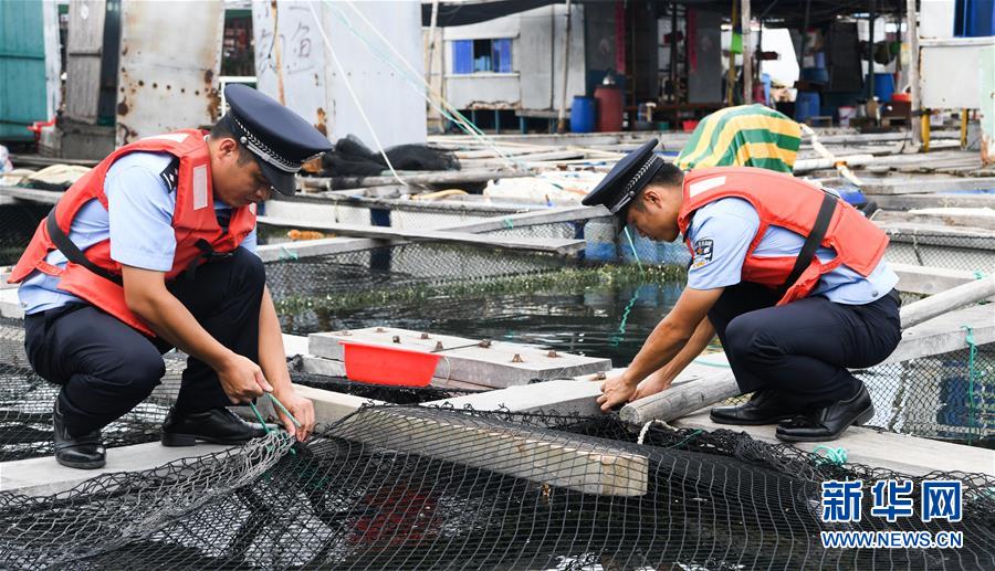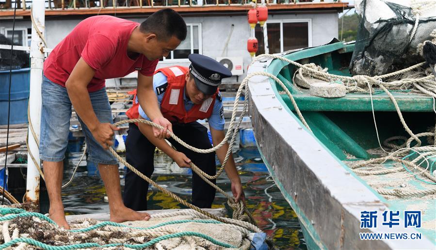 6月13日,海南省公安廳海岸警察總隊(籌備組)陵水支隊民警幫助轄區(qū)內(nèi)漁民固定漁排。當(dāng)日,海南省氣象局于16時30分繼續(xù)發(fā)布臺風(fēng)四級預(yù)警。今年第2號臺風(fēng)“鸚鵡”(熱帶風(fēng)暴級)預(yù)計于14日在廣東沿海登陸。新華社記者楊冠宇攝。