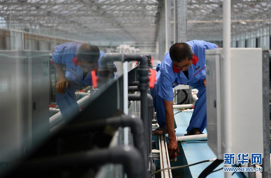 在天津現(xiàn)代晨輝科技集團有限公司的養(yǎng)殖示范場,工人在調試設備(6月15日攝)。新華社記者 李然 攝