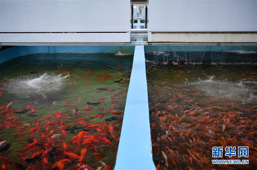 在天津現(xiàn)代晨輝科技集團有限公司的養(yǎng)殖示范場,工人在投喂飼料(6月15日攝)。近年來,天津市寶坻區(qū)大白莊鎮(zhèn)大力發(fā)展觀賞魚養(yǎng)殖,在當?shù)佚堫^企業(yè)的帶動下,成為增加農民收入的新途徑。據(jù)了解,企業(yè)對附近養(yǎng)殖戶統(tǒng)一提供苗種、飼料、技術支持,以及觀賞魚成魚后保價回收的服務。養(yǎng)殖戶每畝水面平均收入約1.8萬元,解決周邊農民就業(yè)近200人。新華社記者 李然 攝