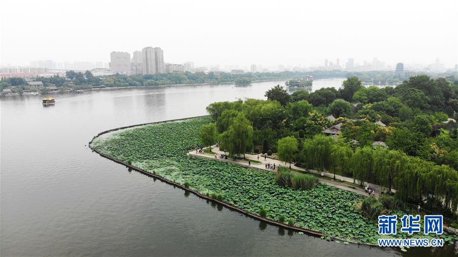 6月19日拍攝的大明湖畔的荷花池(無人機(jī)照片)。近日,山東濟(jì)南大明湖的荷花陸續(xù)綻放,吸引游客前來觀賞。新華社記者 王凱 攝