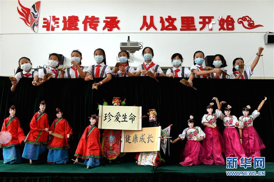 6月22日,連城縣實驗小學(xué)學(xué)生展演連城提線木偶戲,開展禁毒宣傳活動。在“6·26”國際禁毒日來臨之際,福建省連城縣城鄉(xiāng)小學(xué)學(xué)生將提線木偶、雕版印刷及傳統(tǒng)花燈等當(dāng)?shù)乜图曳沁z文化元素,融入校園禁毒宣傳活動中,提高防毒、拒毒和禁毒意識。新華社記者彭張青攝