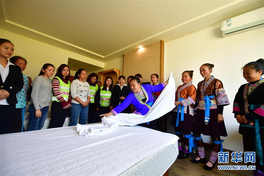 在廣西融水苗族自治縣香粉鄉(xiāng)雨卜村,扶貧工作隊員和致富帶頭人在學(xué)習(xí)客房服務(wù)技能(2019年11月4日攝)。新華社記者黃孝邦攝