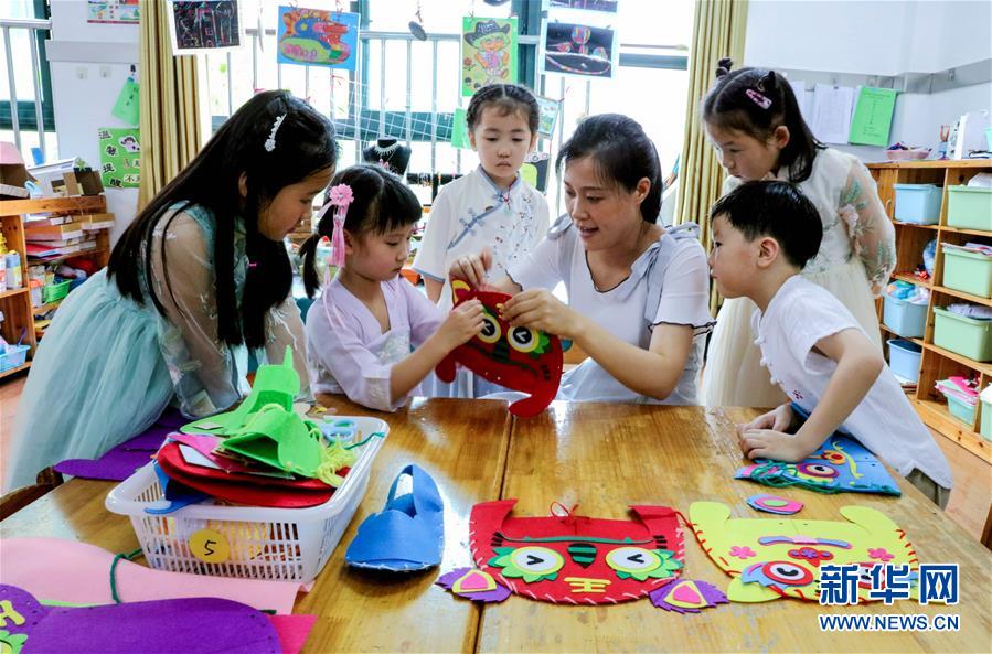 6月23日,長(zhǎng)興縣開發(fā)區(qū)實(shí)驗(yàn)幼兒園的孩子們?cè)诮處熤笇?dǎo)下學(xué)做虎頭鞋、虎頭帽。為了迎接即將到來的端午節(jié),浙江省湖州市長(zhǎng)興縣各個(gè)幼兒園開展“品民俗迎端午”主題活動(dòng),讓小朋友們體驗(yàn)傳統(tǒng)民俗文化。新華社記者徐昱攝