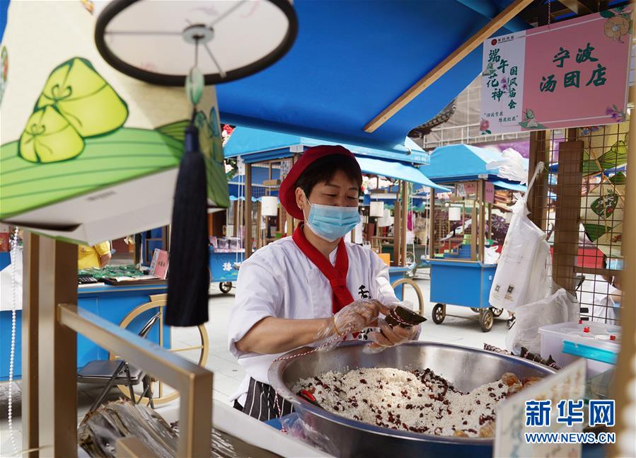 6月24日,在上海豫園舉辦的端午花神國(guó)風(fēng)廟會(huì)上,老字號(hào)寧波湯團(tuán)店的師傅在包制傳統(tǒng)的“枕頭粽”。端午節(jié)臨近,各地舉行包粽子、做香包、賽龍舟等豐富多彩的民俗文化活動(dòng),迎接傳統(tǒng)佳節(jié)的到來(lái)。新華社記者劉穎攝