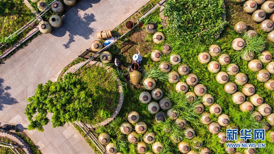赤水曾氏曬醋廠晾曬的醋壇(6月26日攝,無人機(jī)照片)?!俺嗨畷翊住辈捎霉腆w發(fā)酵繁殖產(chǎn)生天然醋酸菌,醋醅和成品醋都在日光下曝曬而成,故稱曬醋?!俺嗨畷翊住敝谱鳉v史悠久,工序考究,2009年被列入貴州省級(jí)非遺名錄。新華社記者 陶亮 攝