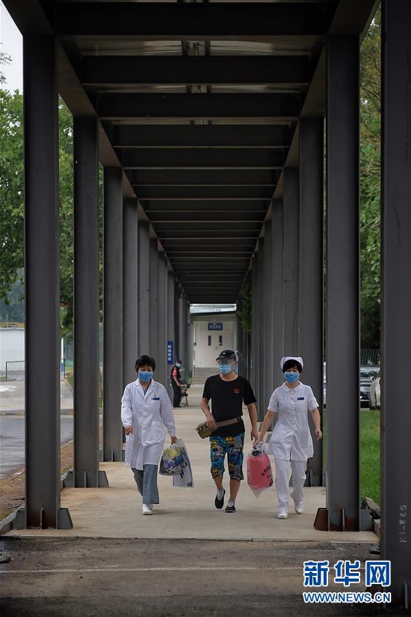6月29日,在北京地壇醫(yī)院內(nèi),醫(yī)護(hù)人員送患者何先生離開隔離病區(qū)。新華社記者彭子洋攝