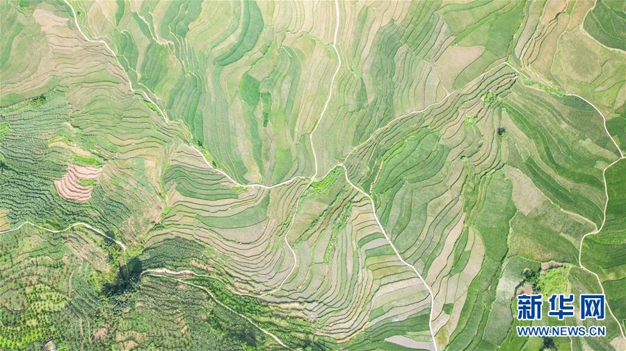 貴州省盤州市新民鎮(zhèn)的梯田風(fēng)光(6月29日攝,無人機(jī)照片)。夏日時節(jié),貴州省盤州市新民鎮(zhèn)的梯田風(fēng)景如畫。新華社記者陶亮攝