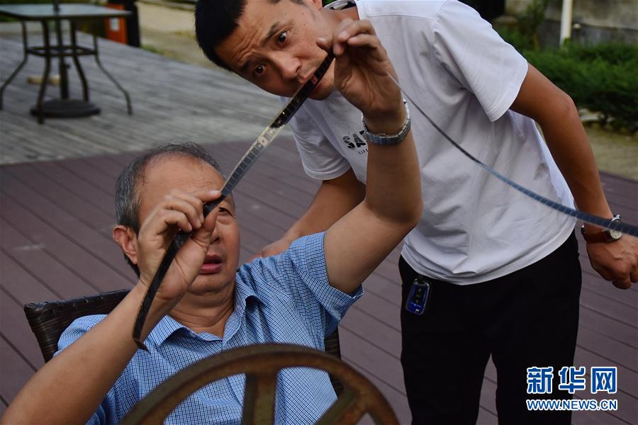 6月30日,朱生榮(左)和兒子朱強(qiáng)(右)在當(dāng)晚電影開(kāi)播前檢查膠片位置。新華社記者鄭夢(mèng)雨攝