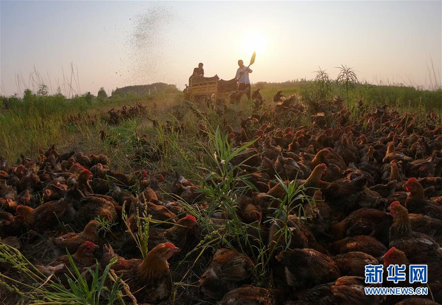 7月1日,在黑龍江省五大連池市的草原上,桑慶軍在拋撒飼料喂雞。新華社記者謝劍飛攝