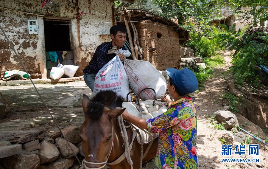 且沙次干把兩袋谷物放在馬背上(6月27日攝)。當(dāng)日,且沙次干和妻子阿達(dá)么日雜把老房子里的糧食、家什等收拾一番,準(zhǔn)備搬進(jìn)村集中安置點(diǎn)的新居。新華社記者 江宏景 攝