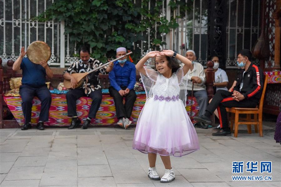 在烏魯木齊大巴扎景區(qū),小朋友跟著音樂起舞(7月4日攝)。夏日周末,烏魯木齊市大巴扎景區(qū)內(nèi)熙熙攘攘,人們來到這里品嘗美食、休閑購物。2018年,經(jīng)過靚化改造后的大巴扎景區(qū)新增長約800米的步行街,分為文創(chuàng)文旅和“非遺”項目街區(qū)、國際時尚街區(qū)和大巴扎美食街區(qū),是烏魯木齊最受歡迎的旅游目的地之一。新華社記者丁磊攝