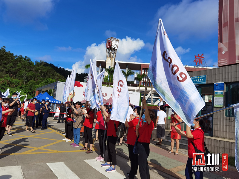 考生學(xué)長來到深圳紅嶺中學(xué)考點(diǎn)門口為學(xué)弟舉起“奧利給”的旗子。