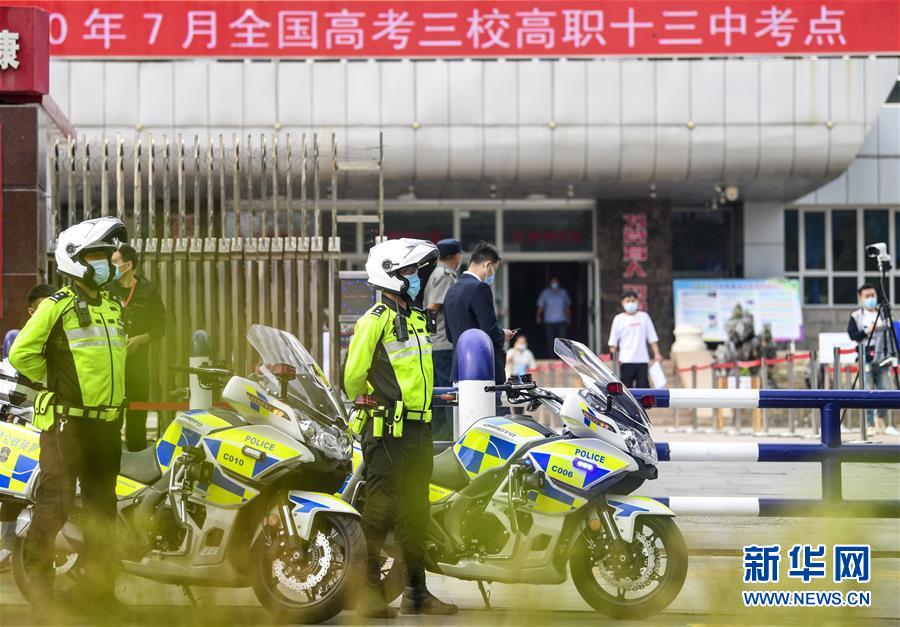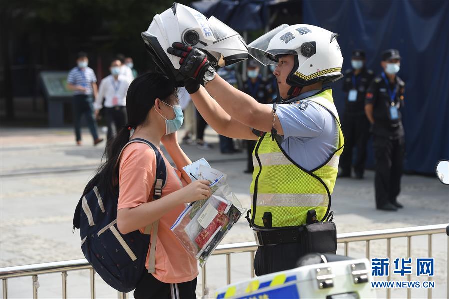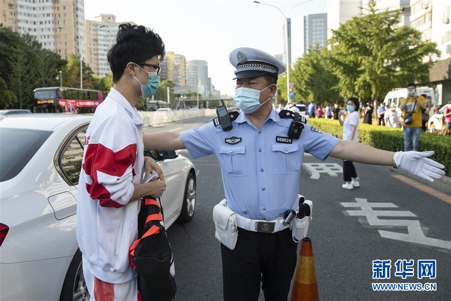 7月7日,在位于北京的中國人民大學附屬中學考點外,北京市公安局公安交通管理局海淀交通支隊中關村大隊交警付云輝在指揮車輛有序行駛。當日,2020年高考拉開帷幕。新華社記者沈伯韓攝