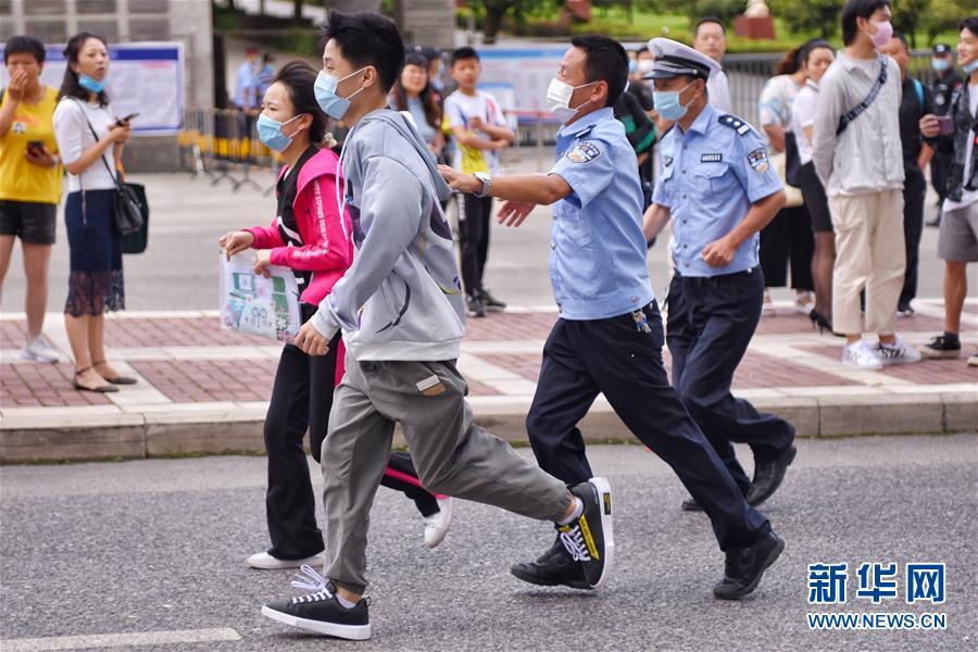 7月7日,在貴州省六盤水市第三中學考點外,兩名考生走錯考場,警察緊急安排車輛送他們前往正確的考場。當日,2020年高考拉開帷幕。新華社記者劉續(xù)攝
