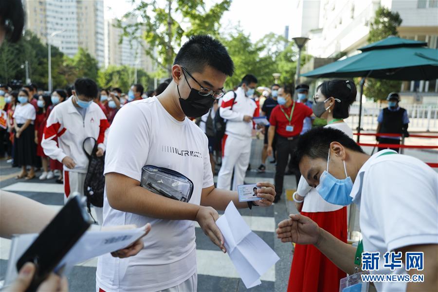 7月7日,在位于北京的中國人民大學(xué)附屬中學(xué)考點外,工作人員查驗考生準(zhǔn)考證和身份證等證件信息。當(dāng)日,2020年高考拉開帷幕。新華社記者沈伯韓攝