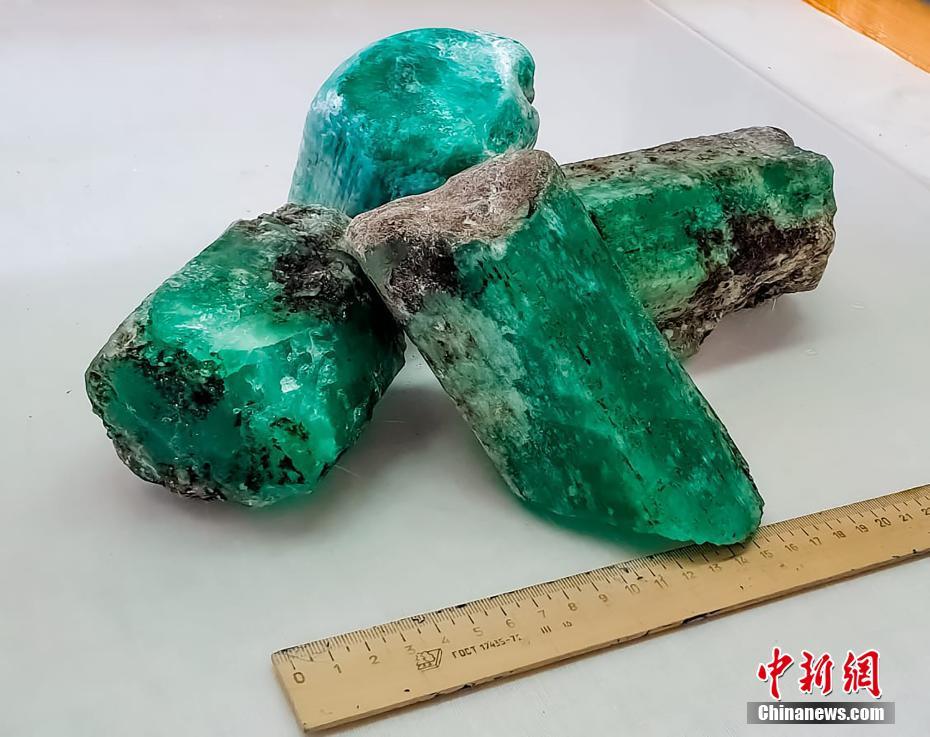 當(dāng)?shù)貢r(shí)間7月7日,俄羅斯斯維爾德洛夫斯克州,俄羅斯國(guó)家技術(shù)集團(tuán)在馬林斯克礦區(qū)內(nèi)發(fā)現(xiàn)總重量達(dá)4.8公斤的4塊綠寶石,是最近20年來發(fā)現(xiàn)的同類品質(zhì)中最大的寶石。圖片來源:視覺中國(guó)