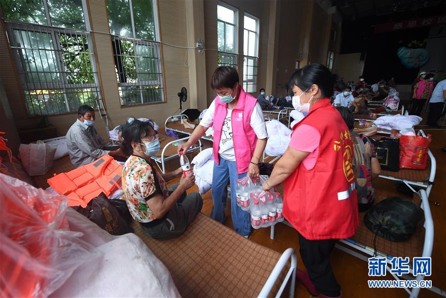 7月8日,在杭州市富陽(yáng)區(qū)東洲街道安置點(diǎn)東洲中心小學(xué),志愿者向村民發(fā)礦泉水等物資。新華社記者徐昱攝