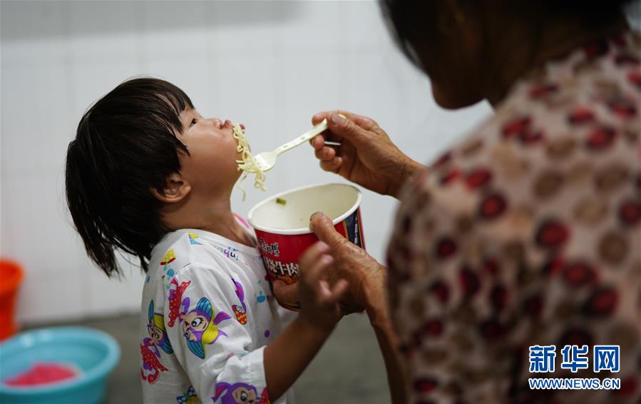 7月9日,村民在給小朋友喂飯。當(dāng)日,江西鄱陽縣鄱陽鎮(zhèn)因洪水受災(zāi)的村民被轉(zhuǎn)移到多個(gè)集中安置點(diǎn)。在鄱陽縣五一中心學(xué)校安置點(diǎn),志愿者和工作人員接到任務(wù)后不到十小時(shí)內(nèi),為被轉(zhuǎn)移村民布置了28間教室,供519人安頓,并為村民發(fā)放褥子、床單、枕頭、盒飯、飲用水等物資。新華社記者周密攝