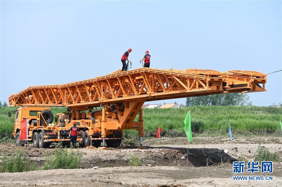7月10日,工作人員在演練現(xiàn)場搭建機械化橋梁。當日,由吉林省交通運輸廳主辦的公路橋梁水毀搶通應急演練在長春市雙陽區(qū)雙陽河舉行,參與演練人員從汛情水毀信息報送、應急裝備快速集結、機械化橋梁搶通搭設、善后處理等方面進行實戰(zhàn)演練。新華社記者張楠攝