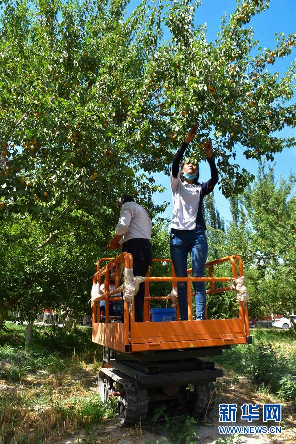 在新疆英吉沙縣龍甫鄉(xiāng)的杏園,村民吾尼其·肉孜在采摘杏子(7月2日攝)。新華社記者高晗攝