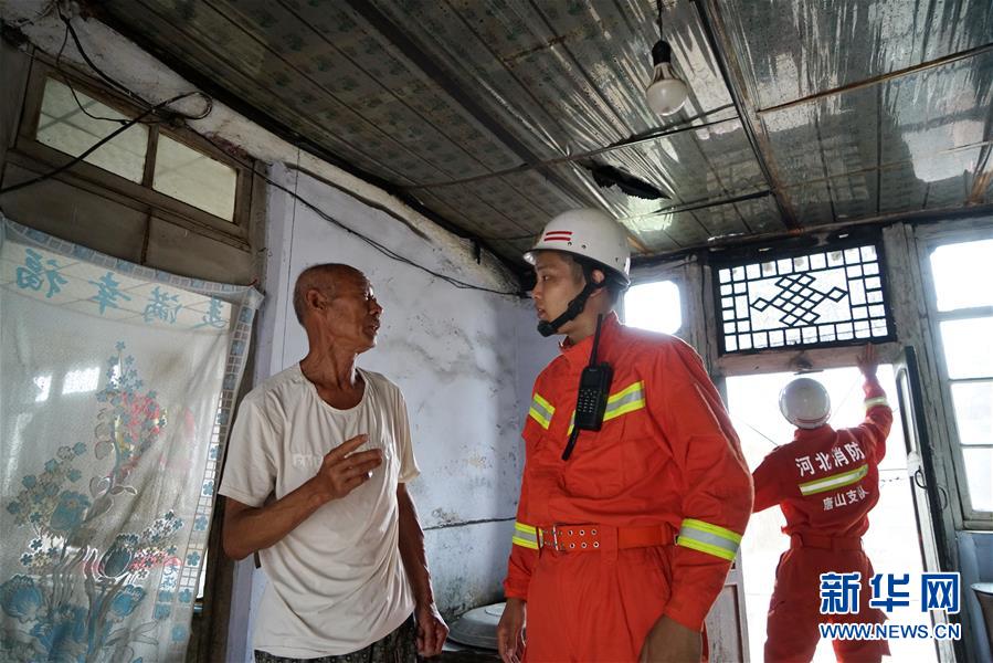 7月12日,消防救援人員在河北省唐山市古冶區(qū)卑家店鎮(zhèn)前巍峰山村村民家中向村民了解情況。新華社記者 牟宇 攝