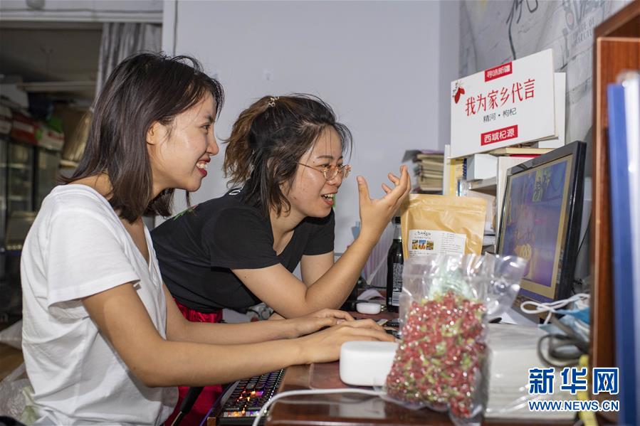 在新疆精河縣城近郊的一處枸杞園,朱虹美(右)和助手李紅英在拍攝視頻,向網(wǎng)友介紹待采收的枸杞(7月11日攝)。新華社記者 胡虎虎 攝