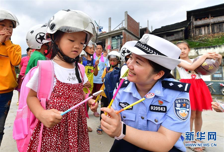7月11日,柳州市交警支隊民警給小朋友贈送交通標(biāo)志鉛筆。當(dāng)日,廣西柳州市交警支隊的民警來到融水苗族自治縣大浪鎮(zhèn)大新村紅鄧屯教學(xué)點(diǎn),開展暑期交通安全教育活動,增強(qiáng)孩子們的安全出行意識。新華社記者黃孝邦攝