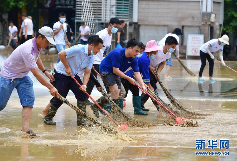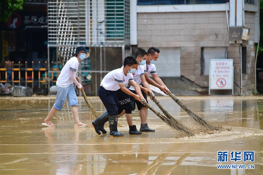 7月12日,融水苗族自治縣文化體育廣電和旅游局清淤小分隊(duì)在蘆笙廣場(chǎng)清理地面。當(dāng)日,在廣西柳州市融水苗族自治縣,融江洪水退去,當(dāng)?shù)叵嚓P(guān)部門(mén)組織多支清淤排險(xiǎn)小分隊(duì),積極開(kāi)展災(zāi)后恢復(fù)工作。新華社記者 黃孝邦 攝