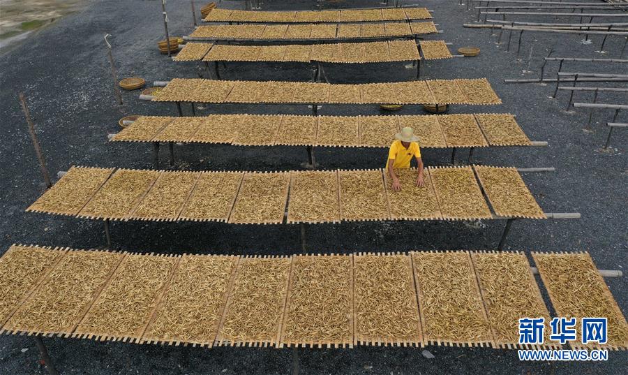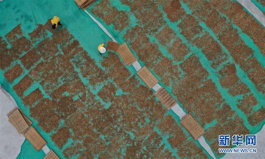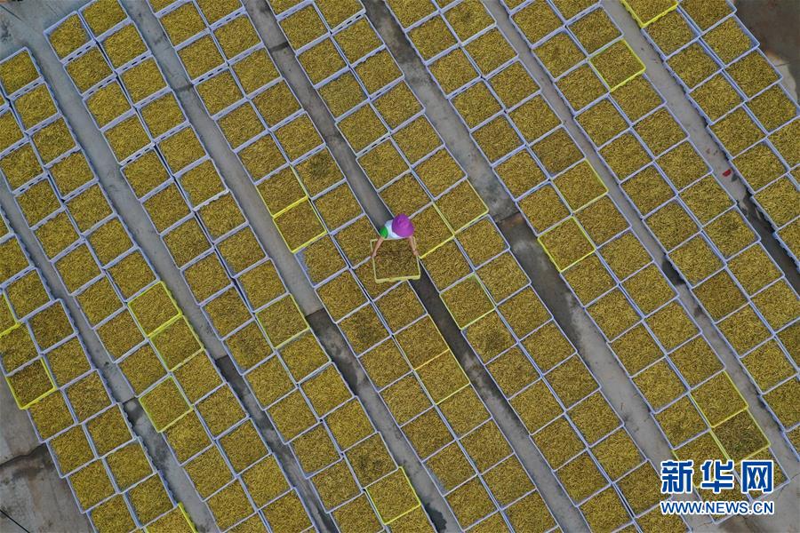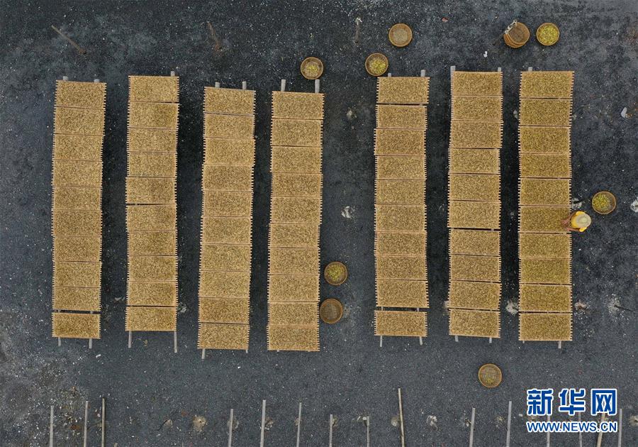 7月12日,祁東縣黃土鋪鎮(zhèn)雁隆食品公司內(nèi),工人在晾曬黃花菜(無(wú)人機(jī)照片)。新華社記者 趙眾志 攝
