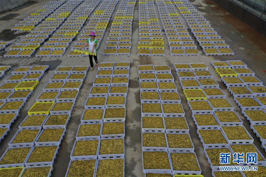 7月12日,祁東縣黃土鋪鎮(zhèn)雁隆食品公司內(nèi),工人通過(guò)傳送帶運(yùn)送黃花菜準(zhǔn)備加工(無(wú)人機(jī)照片)。新華社記者 趙眾志 攝