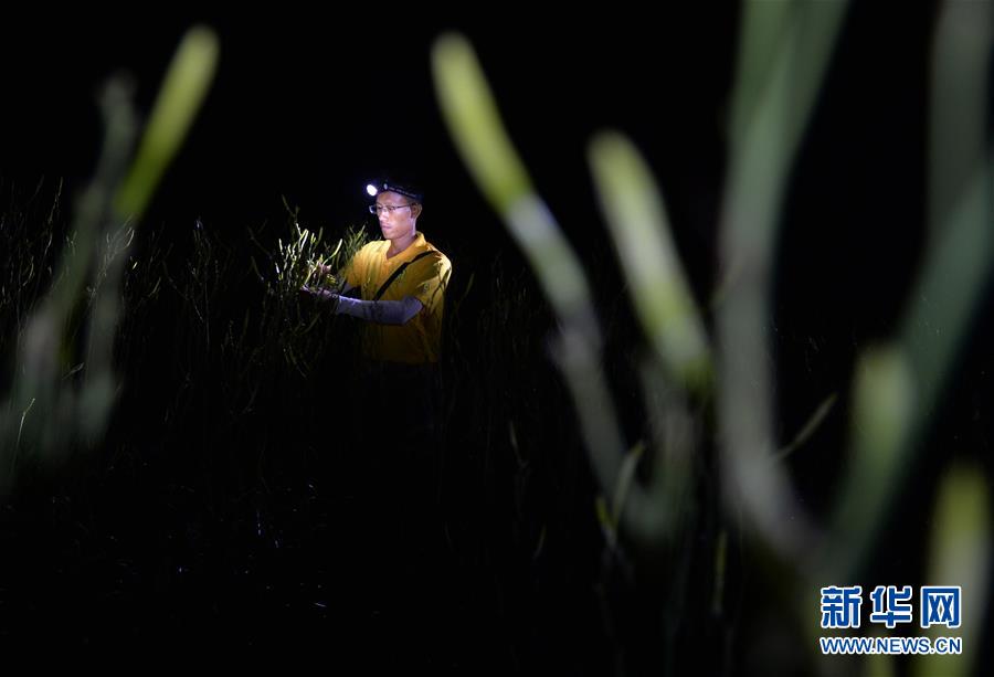 7月12日凌晨,祁東縣官家嘴鎮(zhèn)草源沖村,一名菜農(nóng)戴著頭燈采摘黃花菜。新華社記者 趙眾志 攝